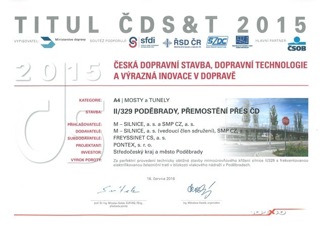 Společnost M – SILNICE a.s. uspěla i ve XIII. ročníku soutěže a získala TITUL ČESKÁ DOPRAVNÍ STAVBA, TECHNOLOGIE, INOVACE ROKU 2015 v kategoriích A,B – „STAVBA“ za akci II/329 Poděbrady, přemostění přes ČD, kterou jakožto vedoucí sdružení realizovala spolu se společností SMP CZ, a.s. Investorem byl Středočeský kraj a město Poděbrady.